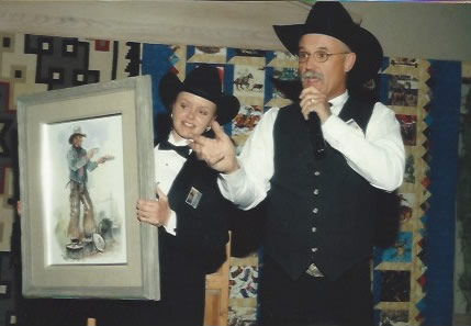 During service of the salads Red was assisted by Don Hedgpeth, Dean Cameron, George Vensel, Bill Blake, and Bill Owen; they worked their way throughout the room, conducting card and dice games. Final playoffs took place at the end of the evening for the prizes of six limited edition prints donated by Bill Owen, Cowboy Artist, Inc.. Canvassing the Four Winds donated their services, canvas transferring the prints, and Montgomery Frames donated beautiful custom frames.